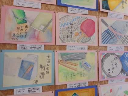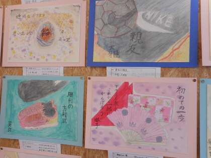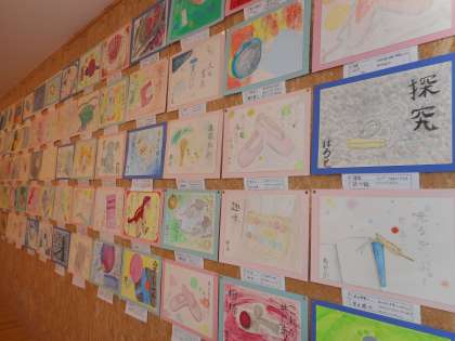 D組前の多目的フロアに、水彩画を掲示しています。にじみやぼかし、重色などを工夫して彩色しています。