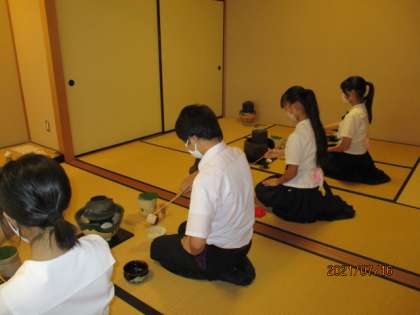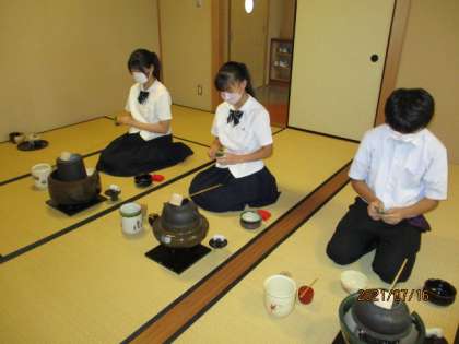 茶道では、夏の暑い時期に「葉蓋(はぶた)」の点前をします。水差しの蓋を植物の葉に替えて、涼しさを演出します。今日は「ハナズオウ」を使いました。蓋にした葉の扱い方を教えてもらいました。
