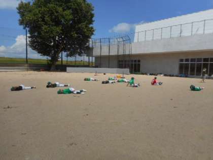 野球部は、体つくりをしていました。股関節のストレッチや体幹を鍛えるトレーニングを行いました。