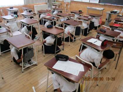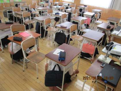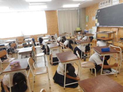 本当に地震が起きたことを想定して、机の下にもぐり、安全を保つ姿勢を確認しました。生徒たちは、真剣に訓練に臨みました。