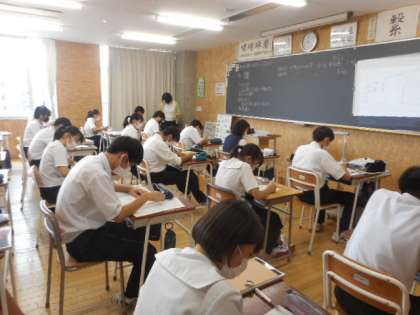 本日の授業(3年生:その1) 公開日 2021/09/02 更新日 2021/09/02 芝園の一日 9月2日(木) 3年生の授業の様子です。 理科では、力学の分野の学習をしました。 国語では、「挨拶—原爆の写真によせて」という詩を通して、平和について考えました。