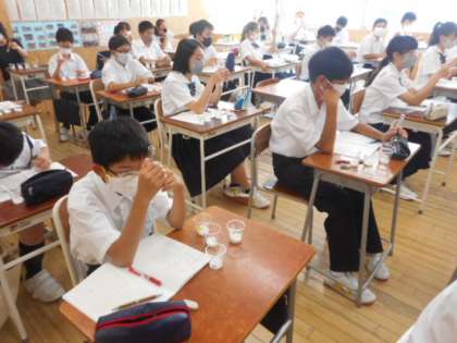 本日の授業(1年生:その1) 公開日 2021/09/03 更新日 2021/09/03 芝園の一日 9月3日(金) 1年生の授業の様子です。 社会では、奈良時代の人々の暮らしについて学習しました。理科では、様々な物質の特徴について比較しながら考えました。
