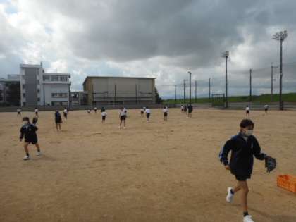 体育では、ソフトボールに取り組みました。距離をとって活動するなど感染症対策を徹底して行っています。