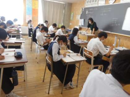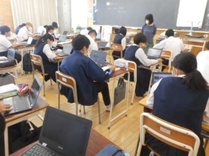 家庭科では、幼児の発達について学習しました。1人1台端末(タブレット)を使い、分からないことをインターネットで調べながら進めました。