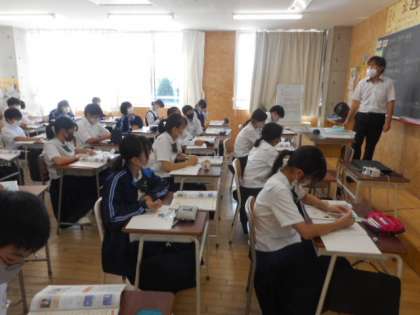 本日の授業(1年生:その1) 公開日 2021/09/09 更新日 2021/09/09 芝園の一日 9月9日(木) 1年生の授業の様子です。 英語では、基本文を繰り返し声に出して読むことで学力の定着を図りました。 理科では、気体の特徴について学習しました。