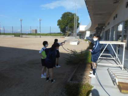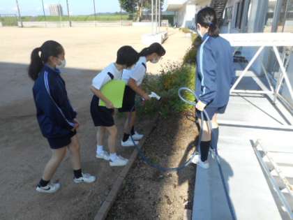 今朝も3年生のGAT(学年アシスタントチーム)のメンバーが、グラウンドの花壇に水やりをしています。