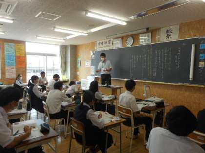 道徳では、「生まれてきてくれてありがとう」という教材を読み、命の尊さについて考えました。教師が体験談を語る場面では、生徒が真剣に話を聞いていました。