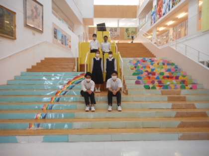 山下生徒会長に、この取組のねらいについて聞いたところ、「卒業した先輩が制作した虹の階段アートの取組を受け継ぎました。コロナ禍で気持ちがふさぎがちになりますが、登校したときに全校生徒が、少しでも明るい気持ちになるようにという願いを込めました。」とのことでした。