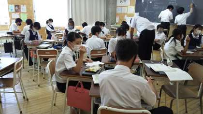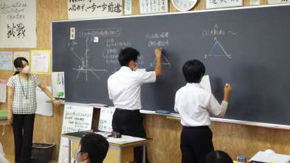 本日の授業(2年生:その1) 公開日 2021/09/15 更新日 2021/09/15 芝園の一日 9月15日(水) 2年生の数学の様子です。 「グラフの中の図形の面積を求めよう」という課題に取り組みました。 グループになって考えました。