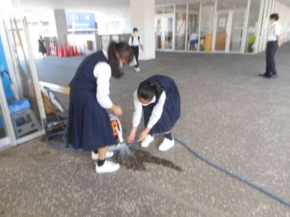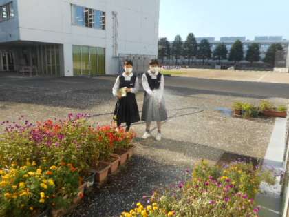1学期から、生徒玄関前のプランターの水やりを継続して行っています。おかげで花は枯れることなく、きれいに咲いています。ホースの片付けも含めて自主的な取組を続けています。