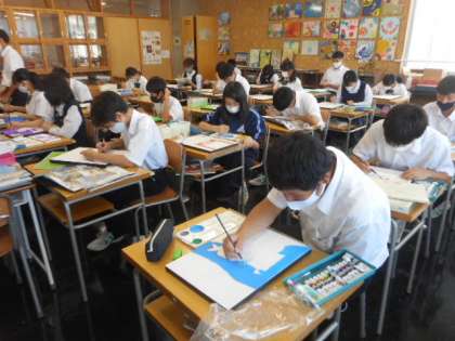 美術では、空想画を制作しました。彩りを工夫して色を塗りました。