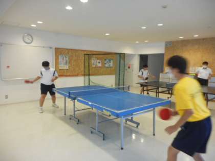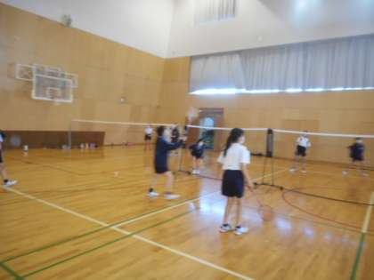 バドミントン部は、ネットをはさみ基礎打ちを行いました。