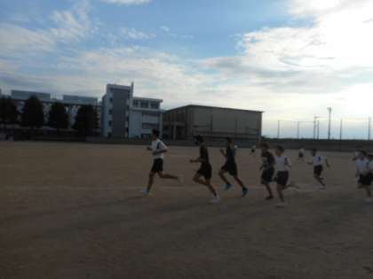 陸上競技部は、全員でウォーミングアップのジョグをしていました。上級生が下級生をリードして練習に取り組んでいました。