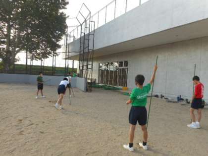 野球部は、園芸用の支柱を使って、体つくりを行いました。肩甲骨の可動域を広げる運動をしました。