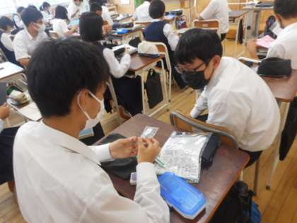 家庭科では、ティッシュケースカバーを制作しました。並縫いやまつり縫いをして仕上げました。