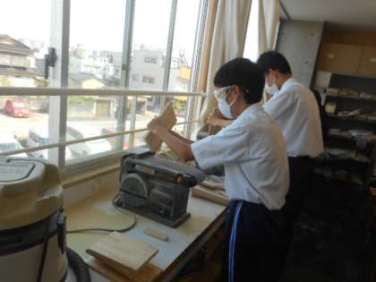 技術では、本棚を制作しています。けがきをした板をノコギリで切断しました。