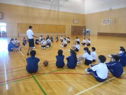 体育では、バスケットボールの授業が始まりました。今日はツーメンパスからレイアップシュートをする練習に取り組みました。