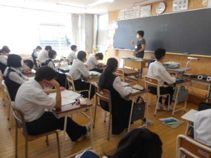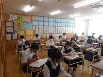 数学では、中間考査の振り返りをしました。ミスが多かった問題や、入試でよく問われる問題について解説を聞きました。