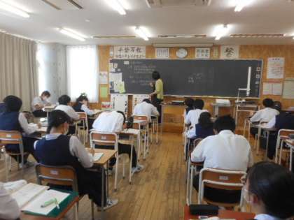 国語では、中間考査の振り返りをしました。自分の考えを書く問題では、文章中から読み取ったことをもとに自分の考えをまとめる方法について確認しました。