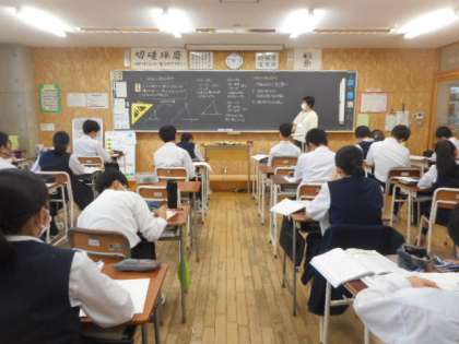 数学では、三角形の証明問題に取り組みました。これまで学習した図形の性質をもとに解法を考えました。