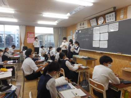 英語では、「学校への提案」を考えようという課題に取り組みました。制服と私服を自由に選択できる提案などを英語で発表しました。