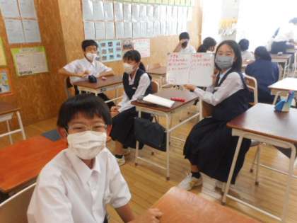 本日の授業(1年生:その2) 公開日 2021/10/15 更新日 2021/10/15 芝園の一日 10月15日(金) 1年生の授業の様子です。 数学では、方程式の計算問題に取り組みました。 学級活動では、校外学習のクラス目標をグループで話し合って決めました。