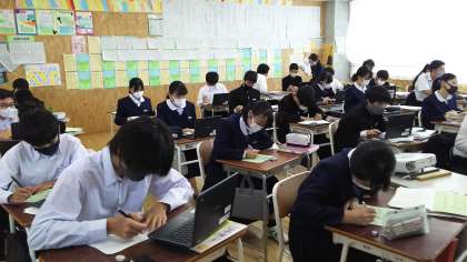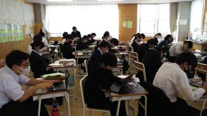 本日の授業(2年生:その4) 公開日 2021/10/27 更新日 2021/10/27 芝園の一日 10月27日(水) 2年生の国語の様子です。 「適切な根拠のある意見文を書く」という課題に取り組みました。