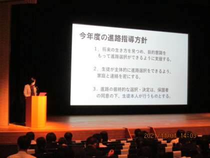 3年生の生徒と保護者を対象に、教育文化会館で「進路説明会」を実施しました。
