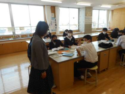 数学では、方程式の応用問題に取り組みました。1年生の数学は、少人数で行っているため、質問のしやすい雰囲気で進められていました。