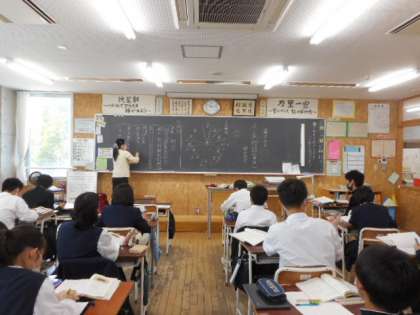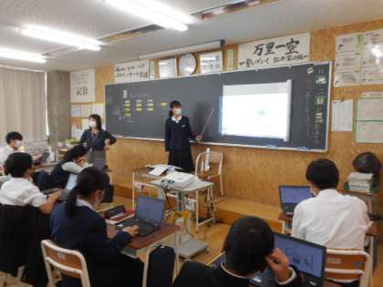 国語では、「平家物語」の扇の的の学習をしました。対句表現などの表現の特徴について確認しました。