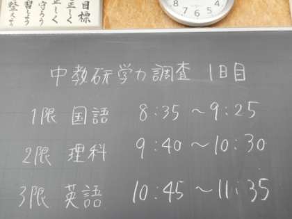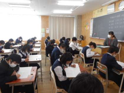 本日の授業(1年生) 公開日 2021/11/04 更新日 2021/11/04 芝園の一日 11月4日(木) 1年生の中教研学力調査一日目の様子です。今日は、1限国語、2限理科、3限英語を実施しました。 明日は、1限社会、2限数学を実施する予定です。