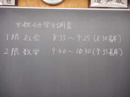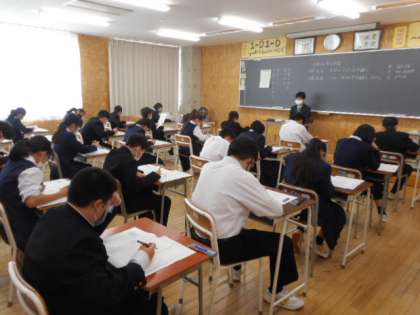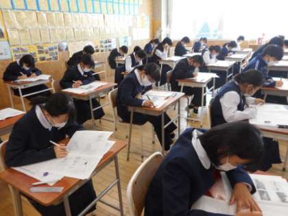 本日の授業(1年生:その1) 公開日 2021/11/05 更新日 2021/11/05 芝園の一日 11月5日(金) 1年生の中教研学力調査二日目の様子です。 今日は、1限社会、2限数学を実施しました。