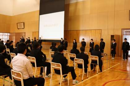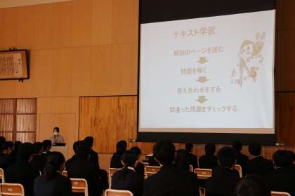 2学年 学年集会 公開日 2021/11/08 更新日 2021/11/08 芝園の一日 11月8日(月) 本日の5限に2学年の学年集会を行いました。 部長や副委員長、後期GSSの生徒が意気込みを発表しました。 また、学年担当の教員がテキストの進め方について説明を行いました。 本日より、テキスト学習を開始します。
