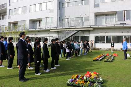 小中学校合同 球根等の贈呈式 公開日 2021/11/08 更新日 2021/11/08 芝園の一日 11月8日(月) 富山昭和ライオンズクラブより球根やパンジーの苗等をいただきました。 その贈呈式が小中合同で行われ、1・2年生の美化委員が参加しました。 いただいた球根等は、後日苗植えを行う予定です。