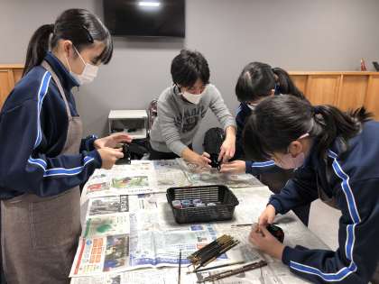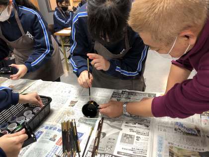 1年生校外学習(その6) 公開日 2021/11/11 更新日 2021/11/11 芝園の一日 11月11日(木) C組の様子です。 高岡地場産業センターで蒔絵体験をしています。描いた絵に金粉をかけています。