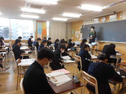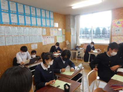 本日の授業(3年生:その1) 公開日 2021/11/11 更新日 2021/11/11 芝園の一日 11月11日(木) 3年生の授業の様子です。 学級活動では、昨日行われた修学旅行の振り返りを書きました。 英語では、リスニング問題に取り組みました。