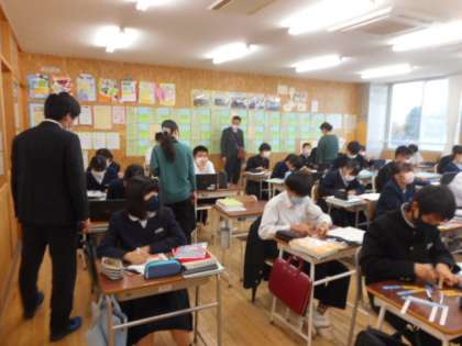 本日の授業(2年生:その2) 公開日 2021/11/12 更新日 2021/11/12 芝園の一日 11月12日(金) 2年生の授業の様子です。 数学では、教育実習生が研究授業を行いました。 美術では、完成した作品にビニールをはりました。