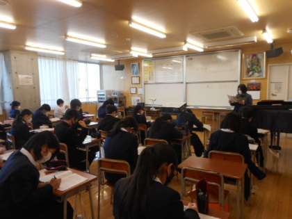 本日の授業(1年生:その2) 公開日 2021/11/18 更新日 2021/11/18 芝園の一日 11月18日(木) 1年生の授業の様子です。 音楽では、シューベルト作曲の「魔王」を鑑賞しました。 英語では、一般動詞を使った英作文を作りました。