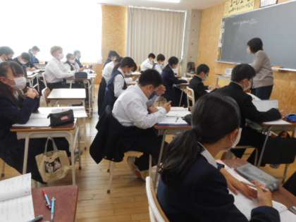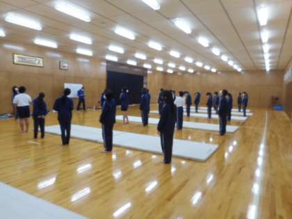 体育では、マット運動を始める前の準備運動をしています。元気にかけ声をかけて取り組んでいました。