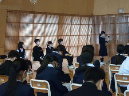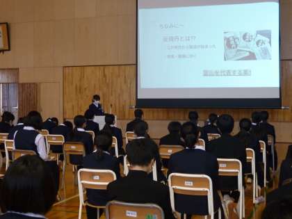 総合的な学習の時間(1学年:その1) 公開日 2021/11/22 更新日 2021/11/22 芝園の一日 11月22日(月) 今日は、総合的な学習の時間に「富山の魅力を発見しよう」というテーマで調べたことを学年の代表が発表する学年発表会を行いました。 先日のクラス発表会で選ばれた各クラスの代表が、それぞれ「富山ブラックラーメン」「富山の薬」「富山の有名な薬」「黒部峡谷が観光名所になるまで」という題目で発表しました。