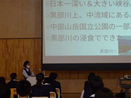 総合的な学習の時間(1学年:その2) 公開日 2021/11/22 更新日 2021/11/22 芝園の一日 11月22日(月) 今日は、総合的な学習の時間に「富山の魅力を発見しよう」というテーマで調べたことを学年の代表が発表する学年発表会を行いました。 先日のクラス発表会で選ばれた各クラスの代表が、それぞれ「富山ブラックラーメン」「富山の薬」「富山の有名な薬」「黒部峡谷が観光名所になるまで」という題目で発表しました。