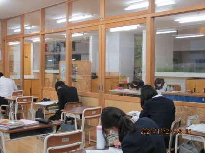 放課後SKIP!(その1) 公開日 2021/11/22 更新日 2021/11/22 芝園の一日 11月22日(月) あさってから始まる「期末考査」に向けて、放課後、仲間と一緒に思い思いの場所で学習しています。