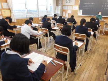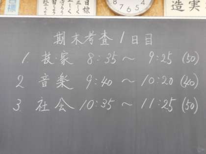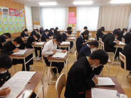 本日の授業(2年生:その1) 公開日 2021/11/24 更新日 2021/11/24 芝園の一日 11月24日(水) 2年生の期末考査1日目の様子です。 今日は、1限技・家、2限音楽、3限社会を実施しました。2日目は、1限英語、2限保体、理科理科の予定です。