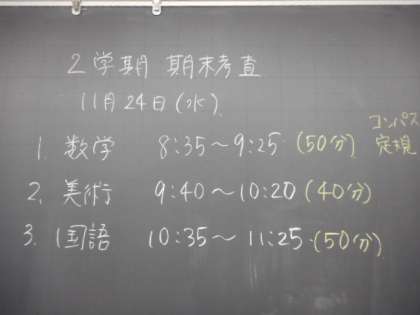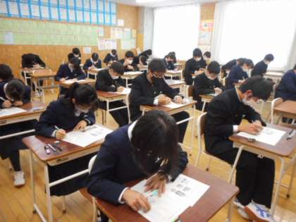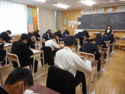 本日の授業(3年生:その1) 公開日 2021/11/24 更新日 2021/11/24 芝園の一日 11月24日(水) 3年生の期末考査1日目の様子です。 今日は、1限数学、2限美術、3限国語を実施しました。 2日目は、1限技・家、2限音楽、3限社会の予定です。