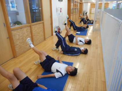 陸上競技部は、冬季練習の期間に入り、室内で体幹を鍛えるトレーニングをしました。