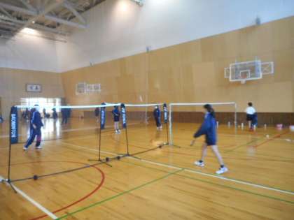 バドミントン部はネットをはさんで基礎打ちをしました。
