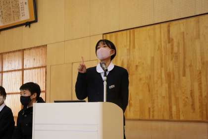 2学年では、英語の授業で行われた「My recommended Place in Unazuki.」の英作文のスピーチを、各クラスの代表者が発表しました。