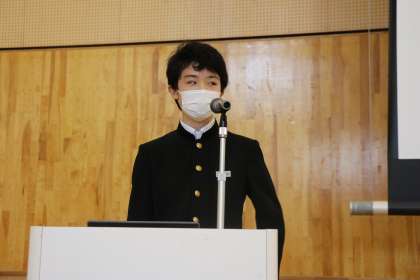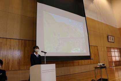 2学年では、英語の授業で行われた「My recommended Place in Unazuki.」の英作文のスピーチを、各クラスの代表者が発表しました。