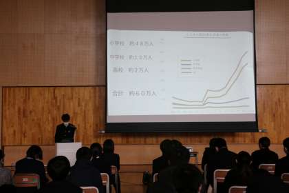 2学年 総合(その4) 公開日 2021/12/01 更新日 2021/12/01 芝園の一日 12月1日(水) 本日の2学年の総合の様子です。 総合で取り組んでいる平和学習において、「『平和』な社会をめざして〜多様性と調和〜」というテーマで課題を追究し、代表の9名の生徒が発表を行いました。