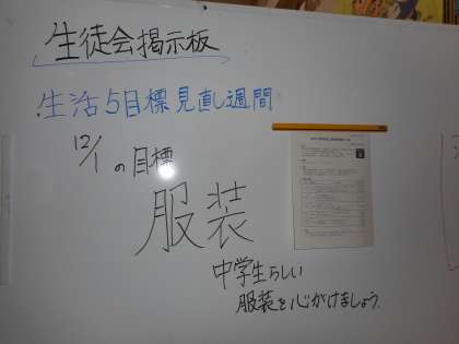生徒会活動 執行部 公開日 2021/12/01 更新日 2021/12/01 芝園の一日 12月1日(水) 今週は「生活五目標見直し週間」を設定し、毎日項目を変えながら全学年で意識して取り組んでいます。 活動内容は、クロームブックや放送など様々な方法で発信し工夫しています。